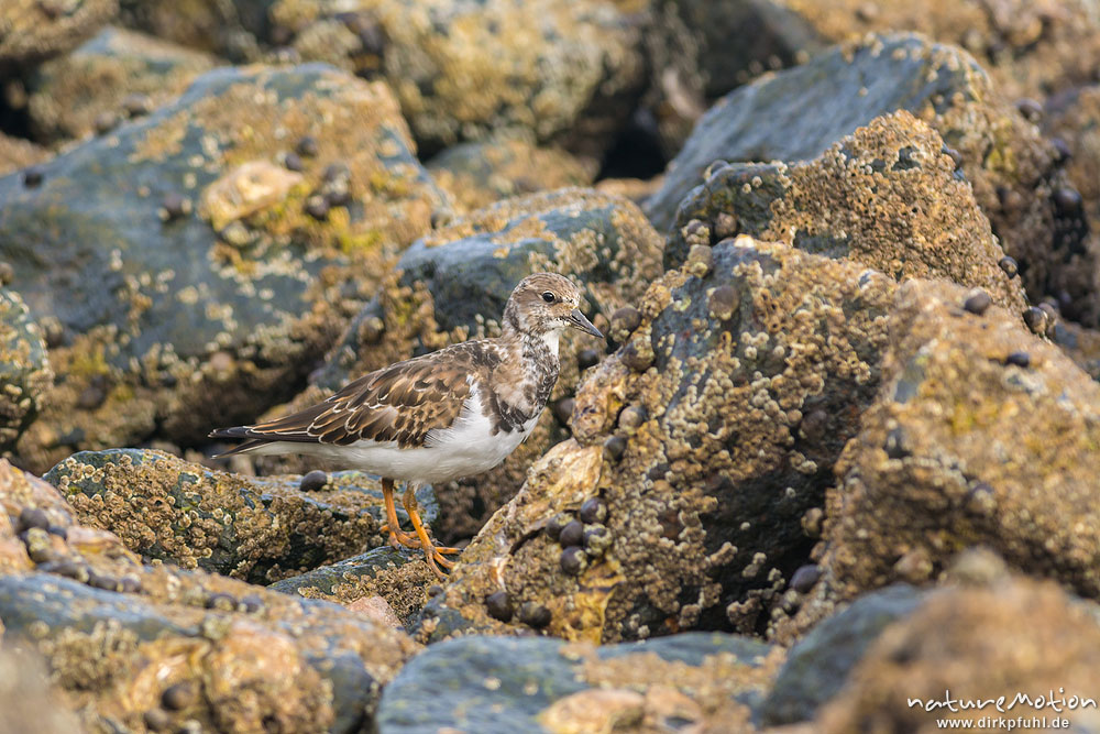 Steinwälzer, Arenaria interpres, Schnepfenvögel (Scolopacidae), Tier auf Nahrungssuche zwischen Muschelbänken, Tarnung,, Borkum, Deutschland