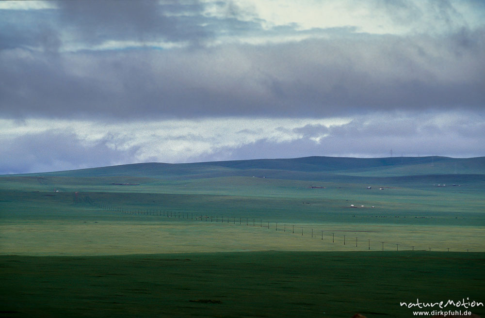 Steppe mit kleinen Jurtensiedlungen und Telefonleitung, regenverhangener Himmel Changai, Mongolei