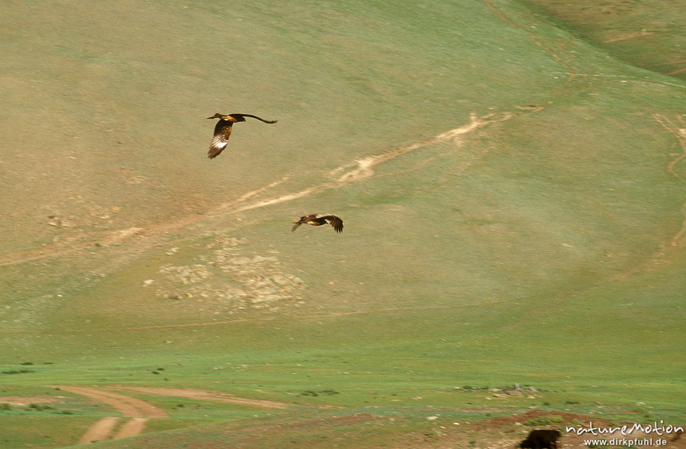 Steppenadler, Aquila nipalensis, Accipitridae (?), zwei Greifvögel im Flug über die Steppe, Changai, Mongolei
