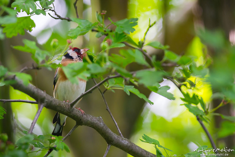 Stieglitz, Distelfink, Carduelis carduelis, Finken (Fringillidae), Alttier im dichten Laub eines Weißdorns direkt über Fußweg, Levinscher Park, A nature document - not arranged nor manipulated, Göttingen, Deutschland