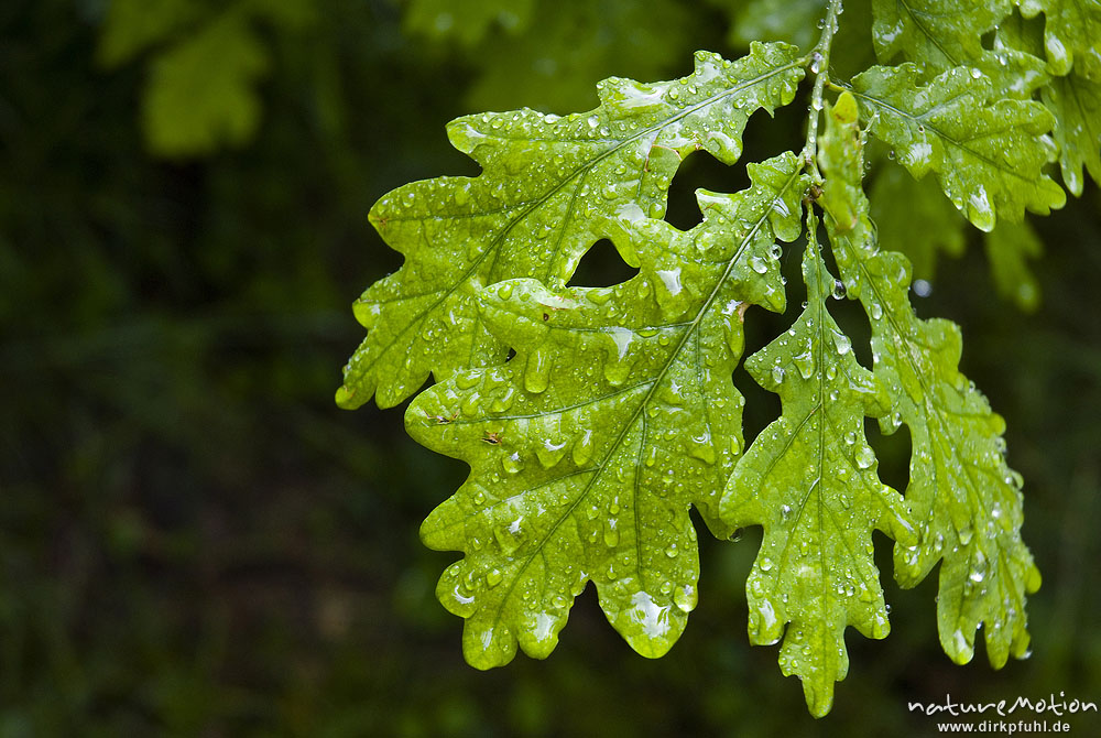 Stieleiche, Quercus robur, Fagaceae, Blätter mit Regentropfen Familienpark Sottrum, Deutschland