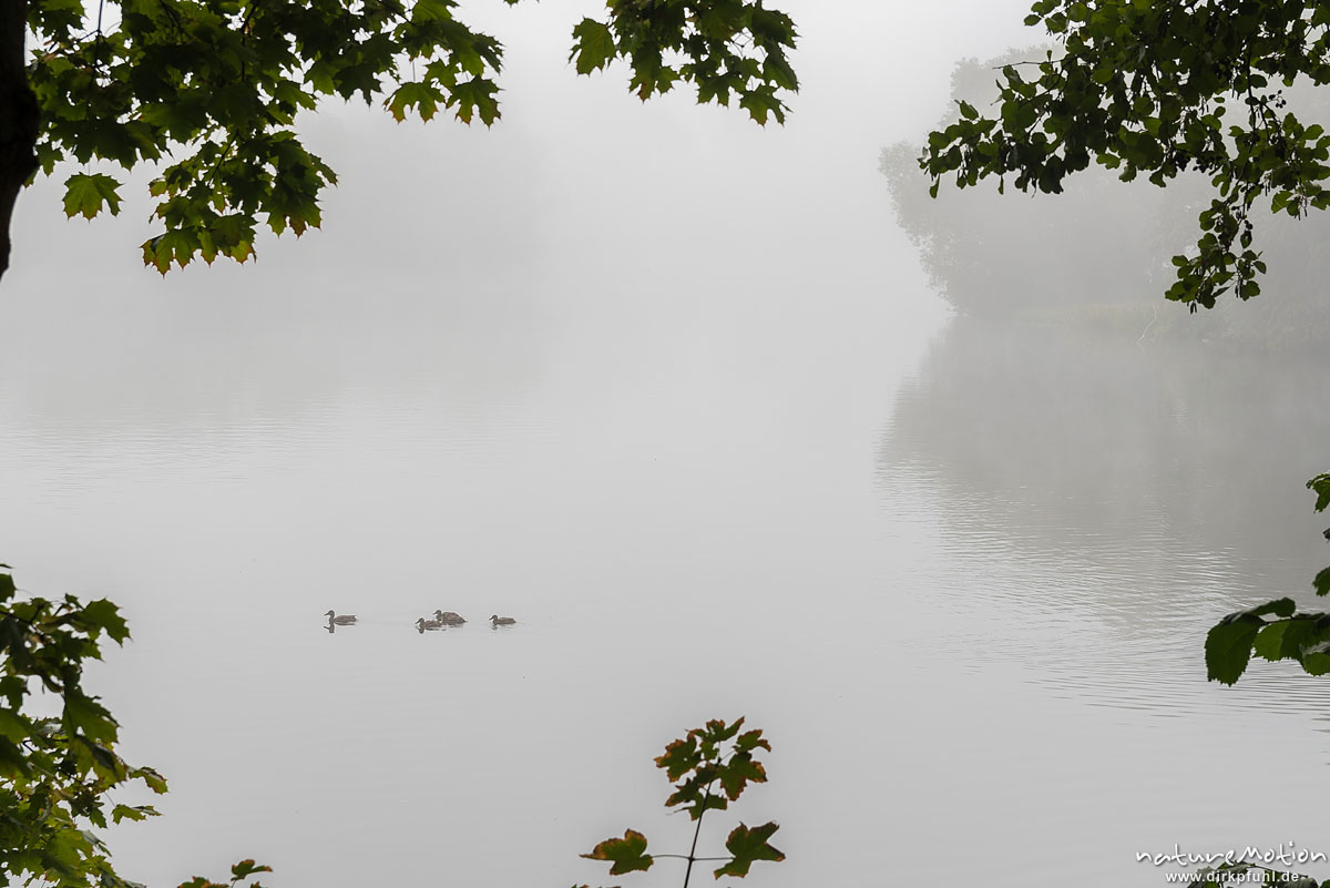 Stockente, Anas platyrhynchos, Anatidae, Gruppe von Jungvögeln schwimmt durch den Nebel, Kiessee, Göttingen, Deutschland