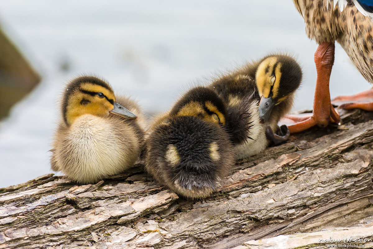 Stockente, Anas platyrhynchos, Anatidae, junge Küken auf im Wasserliegenden Stamm einer Weide, Altti, Göttingen, Deutschland