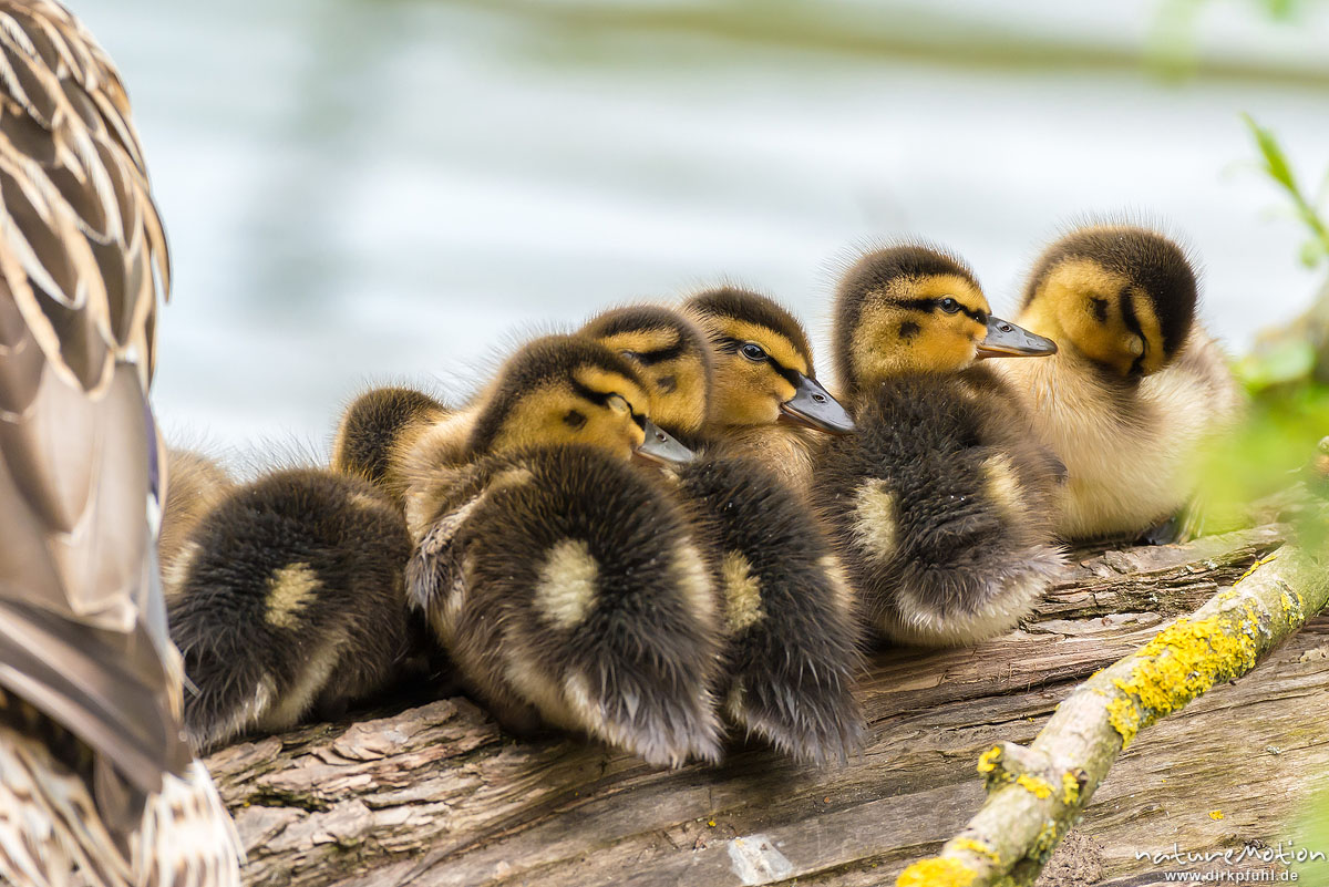 Stockente, Anas platyrhynchos, Anatidae, junge Küken auf im Wasserliegenden Stamm einer Weide, Altti, Göttingen, Deutschland
