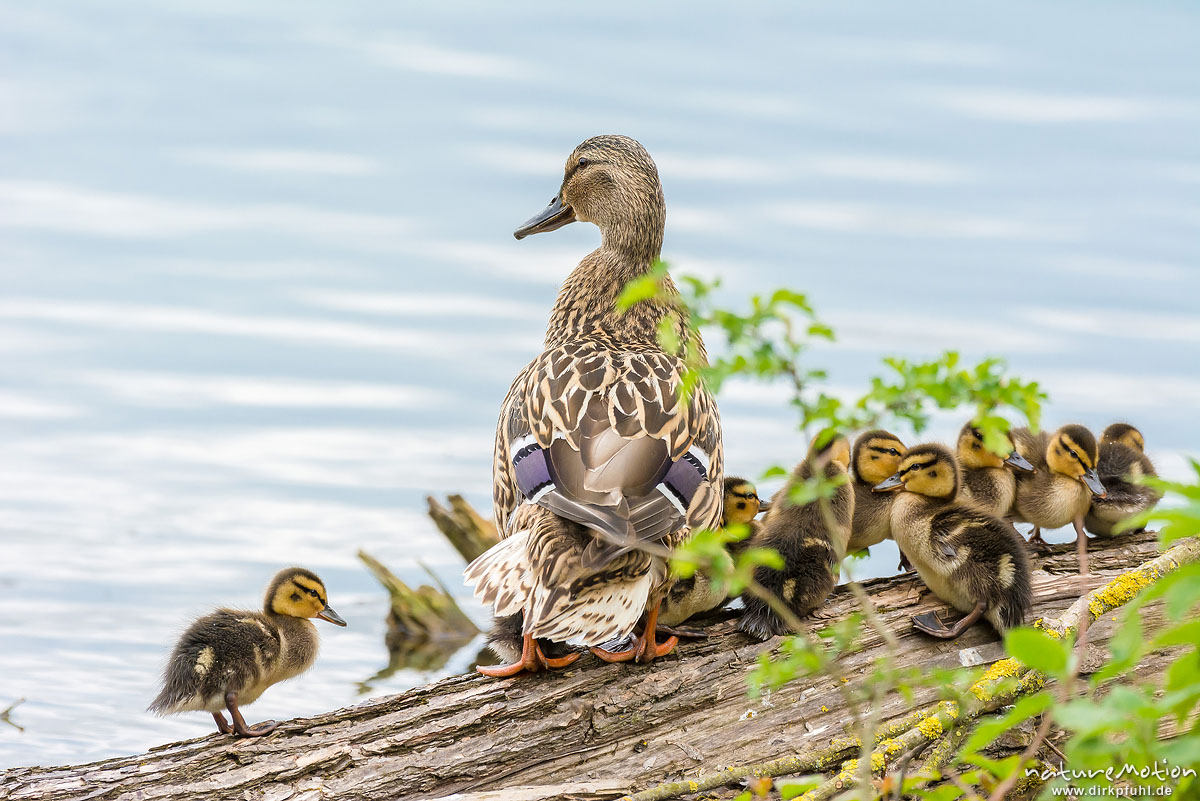 Stockente, Anas platyrhynchos, Anatidae, junge Küken auf im Wasserliegenden Stamm einer Weide, Alttier, Körperpflege, Kiessee, Göttingen, Deutschland