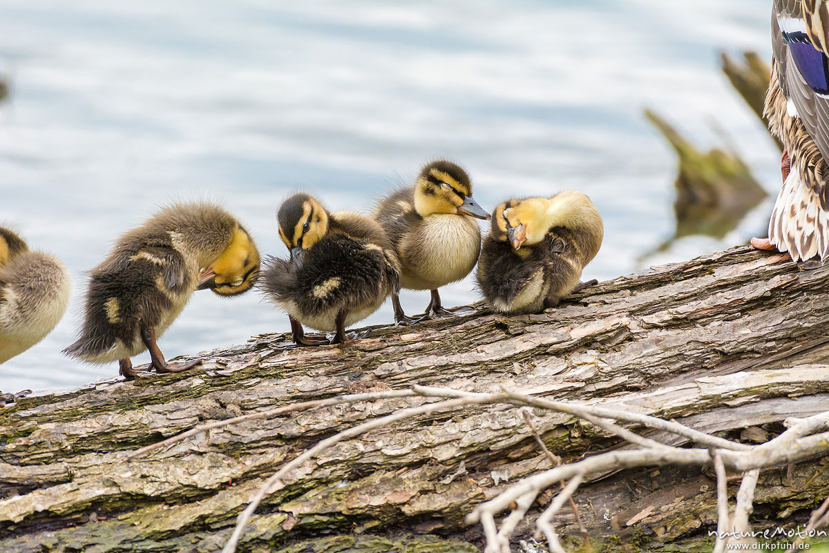 Stockente, Anas platyrhynchos, Anatidae, junge Küken auf im Wasserliegenden Stamm einer Weide, Alttier, Körperpflege, Kiessee, Göttingen, Deutschland
