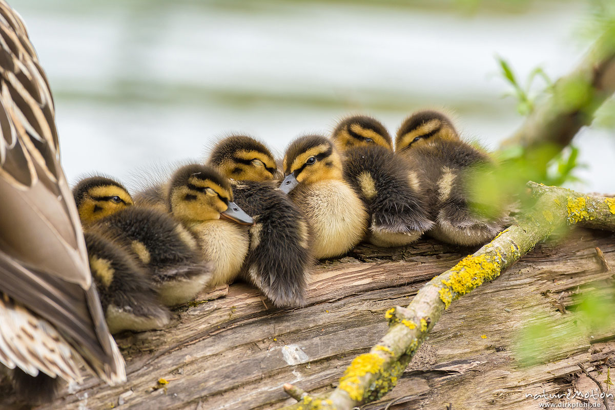 Stockente, Anas platyrhynchos, Anatidae, junge Küken auf im Wasserliegenden Stamm einer Weide, Altti, Göttingen, Deutschland