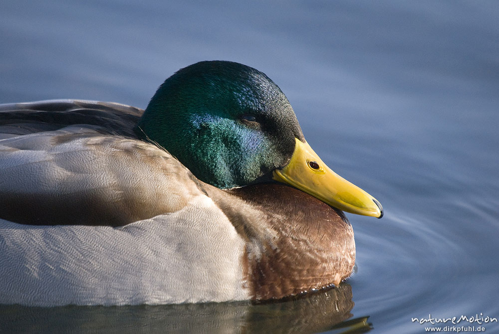Stockente, Anas platyrhynchos, Anatidae, Männchen, Erpel, Kopf, Leine Göttingen, Deutschland