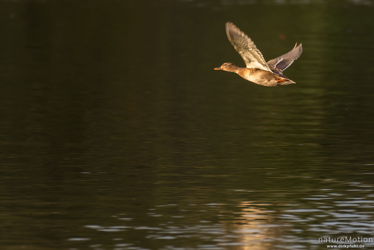 Stockente, Anas platyrhynchos, Anatidae, Weibchen, fliegt dicht über der Wasseroberfläche, Kiesee, Göttingen, Deutschland