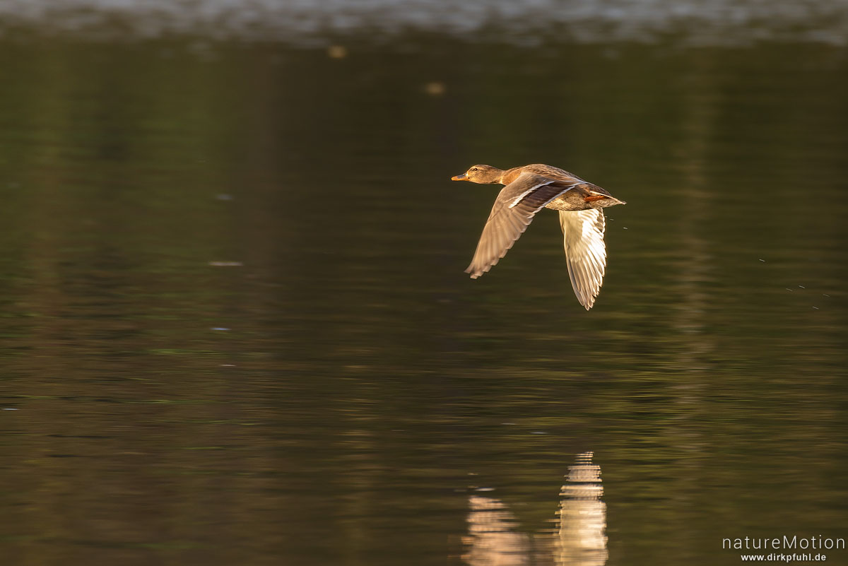 Stockente, Anas platyrhynchos, Anatidae, Weibchen, fliegt dicht über der Wasseroberfläche, Kiesee, Göttingen, Deutschland