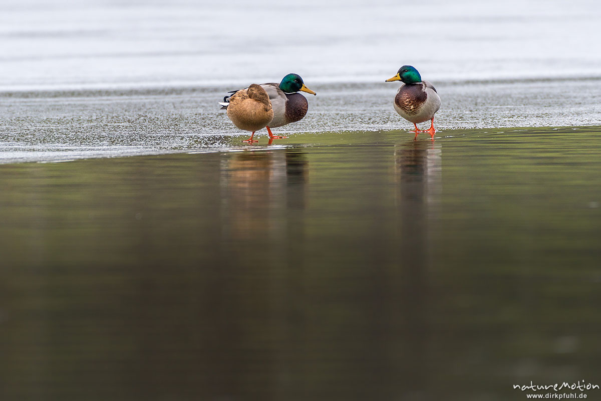 Stockente, Anas platyrhynchos, Anatidae, zwei Männchen und ein Weibchen stehen auf dem Eis, Kiessee, Göttingen, Deutschland