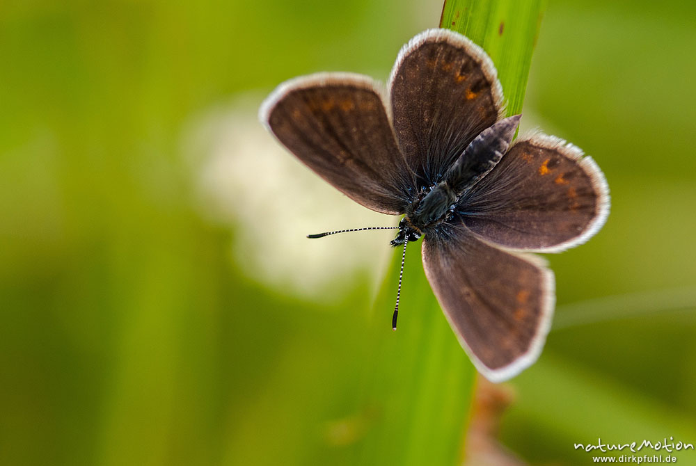 Storchschnabel-Bläuling, Schwarzbraune Bläuling, Aricia eumedon, Eumedonia eumedon, Plebejus eumedon, Bläulinge (Lycaenidae),Tier sitzend an Grashalm, ehemaliger Grenzstreifen der deutsch-deutschen-Grenze, A nature document - not arranged nor manipulated, Hitzelrode, Deutschland