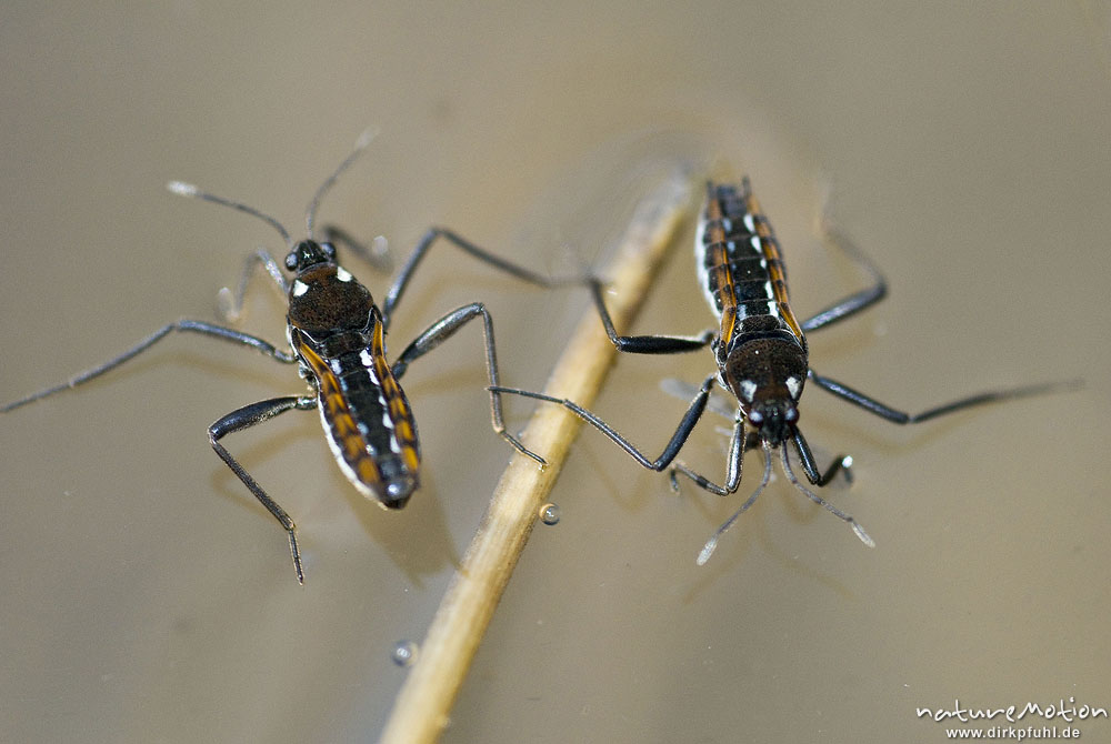 Stoßwassrläufer, Großer Bachläufer, Velia caprai, Bachläufer (Veliidae), an Pflanzenstengel auf Wass, Ebergötzen bei Göttingen, Deutschland