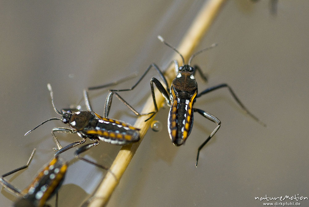 Stoßwassrläufer, Großer Bachläufer, Velia caprai, Bachläufer (Veliidae), an Pflanzenstengel auf Wasseroberfläche, Weisswasserbach, A nature document - not arranged nor manipulated, Ebergötzen bei Göttingen, Deutschland