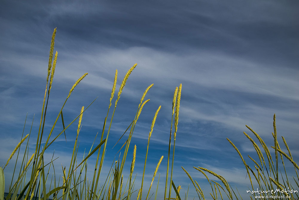 Strandhafer, Gewöhnlicher Strandhafer, Ammophila arenaria, Süßgräser (Poaceae), blühende Gräser vor Sommerhimmel, Strand von Prerow, Darß, Zingst, Deutschland