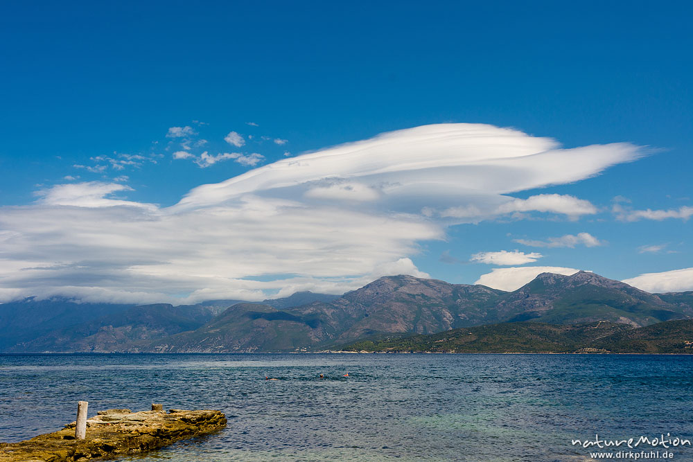 Stratocumulus lenticularis, Lenticularis Wolke über den Bergen des Cap Corse, Bucht von Saint Florent, Korsika, Frankreich