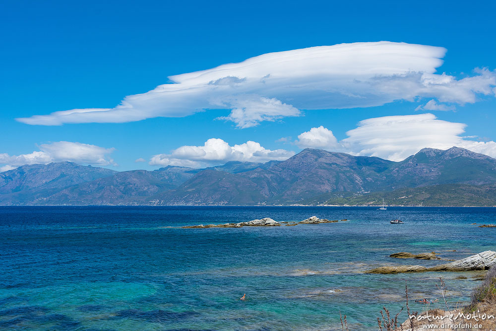 Stratocumulus lenticularis, Lenticularis Wolke über den Bergen des Cap Corse, Bucht von Saint Florent, Korsika, Frankreich