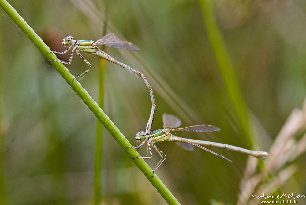 Südliche Binsenjungfer, Lestes barbarus, Teichjungfern (Lestidae), Paar, Tandem an Binsenhalm, Seitenansicht, Tripkenpfuhl, Art ist normalerweise seltener Gast aus Südeuropa, Göttingen, Deutschland