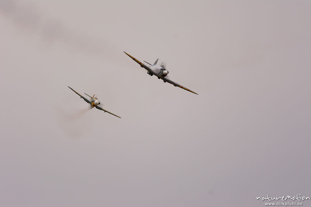 Supermarine Spitfire und Messerschmitt Bf 109 G, Modellflugzeug, Formationsflug mit Rauch, Mega Flugshow 2013 des MSV Condor Göttingen e.V., Göttingen, Deutschland