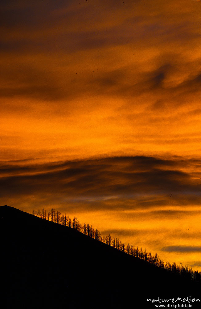 Sonnenuntergang, Bergrücken mit Lärchen vor rot-orangenem ...