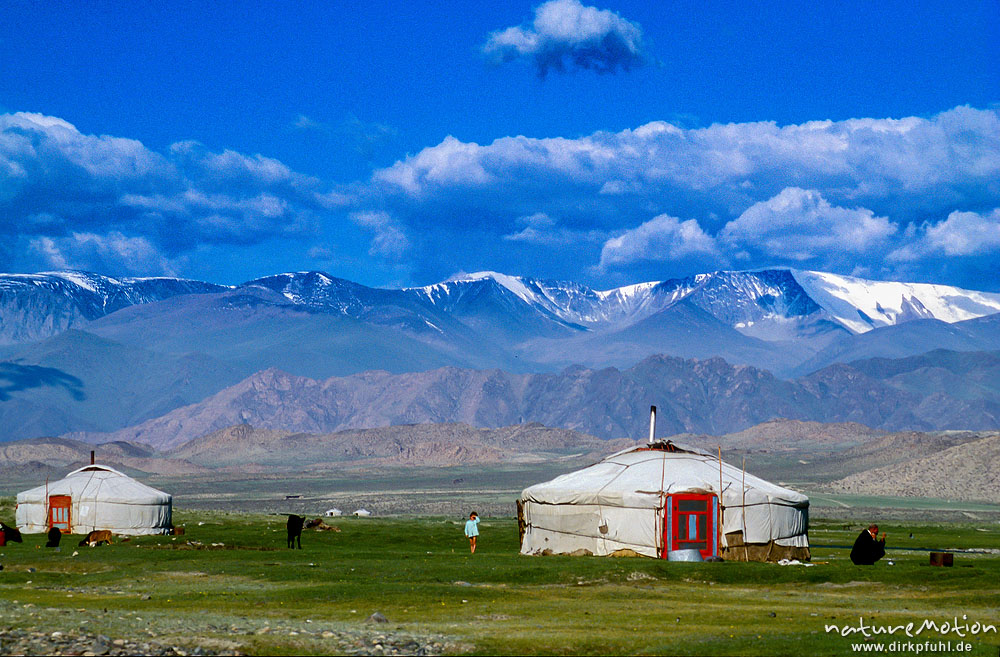 zwei Jurten vor schneebedeckten Berggipfeln, Altai – G ...