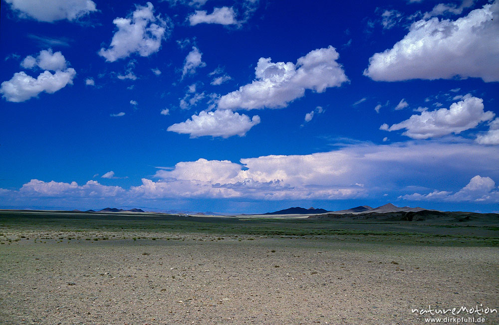 Steppe, trockene Zone, Hügelketten am Horizont, blauer Himm ...