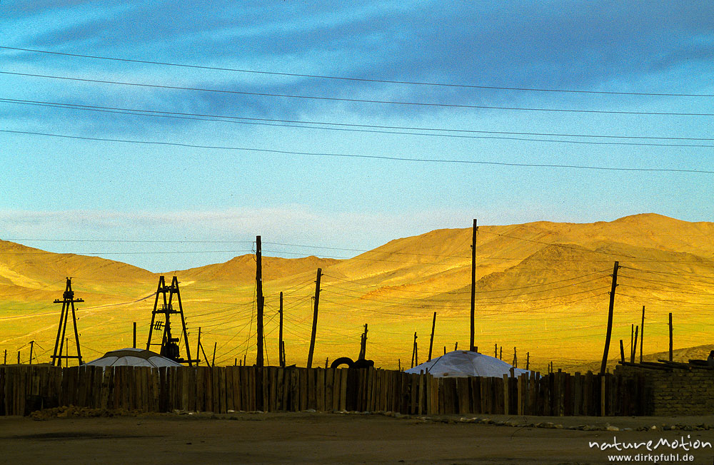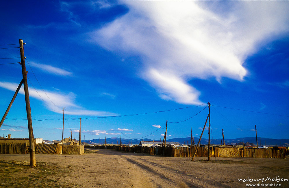Jurtensiedlung, leerer Platz mit Telefonleitungen, Chowd, , ...