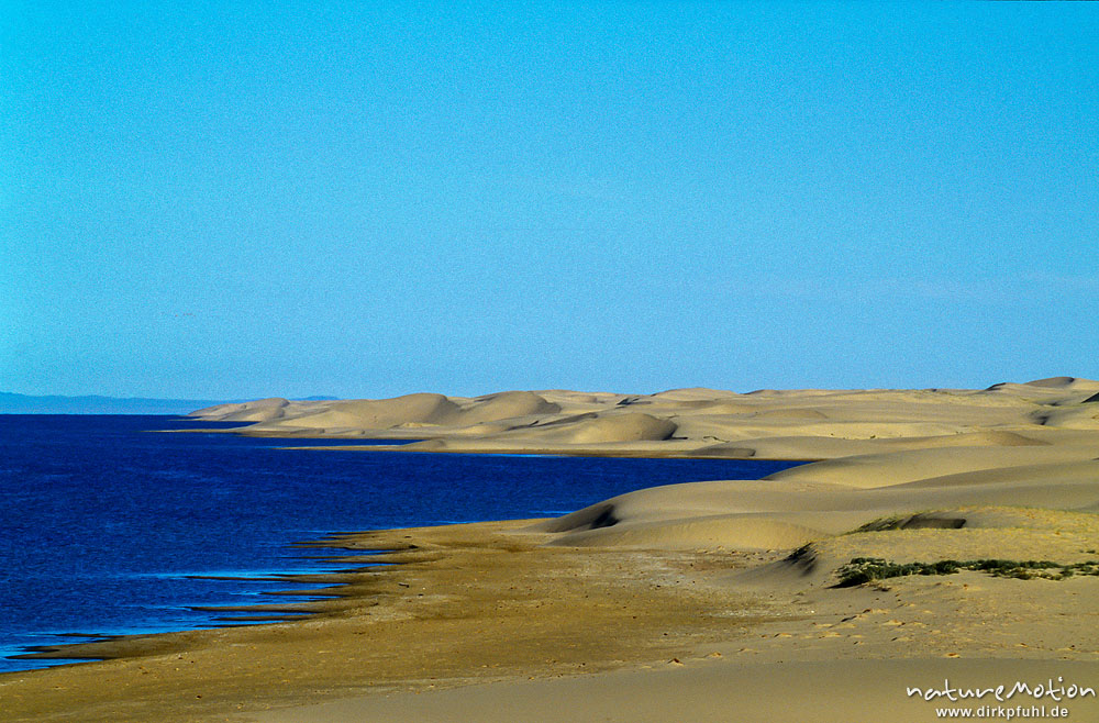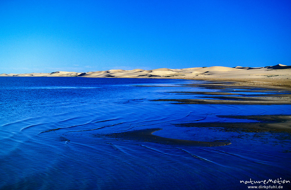 Dörgön Nuur und Sanddünen von Mongol Els, blaues Wasser, ...