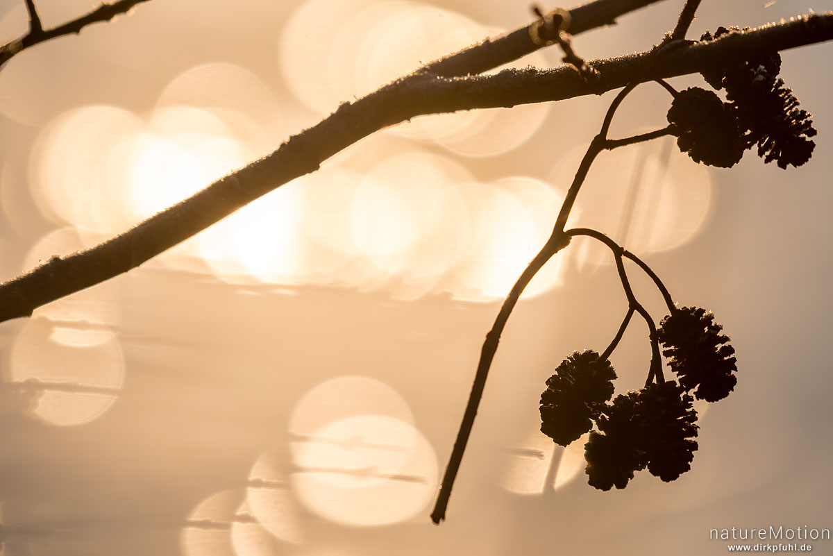 Erlenfrüchte im Gegenlicht, Kiessee, Göttingen, Deutschlan ...