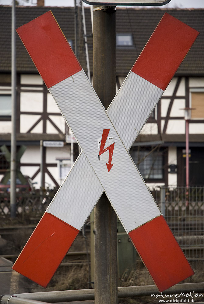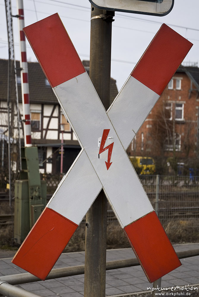 Andreaskreuz mit Hochspannungssymbol, Bahnübergang Friedlan ...