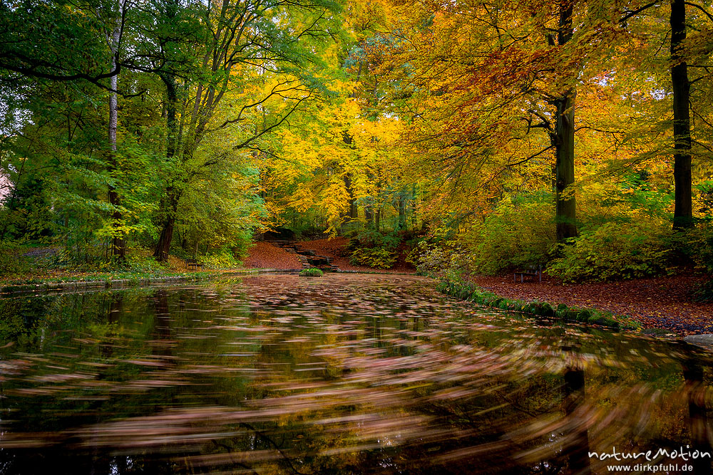 Teich mit Herbstlaub, Bäume in Herbstfärbung, Blätter tre ...