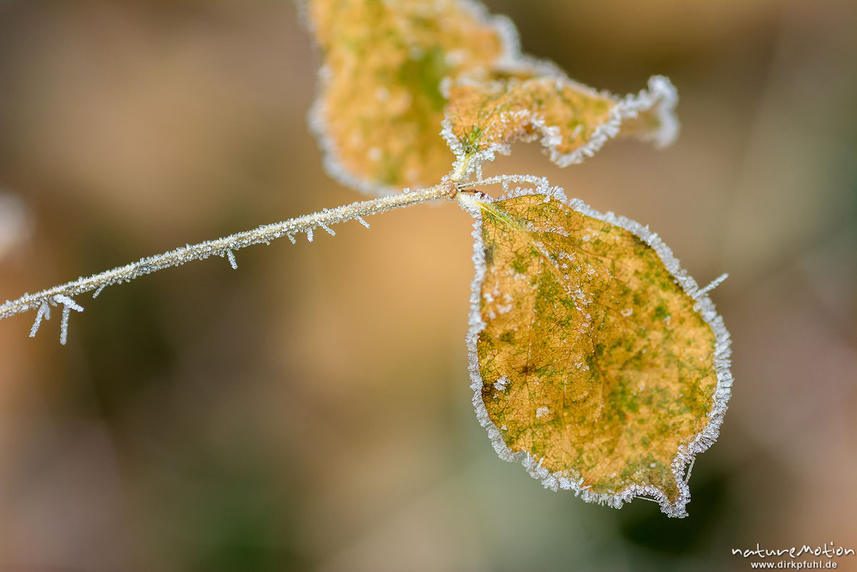 vertrocknete Blätter, mit Raureif bedeckt, Göttinger Wald, ...