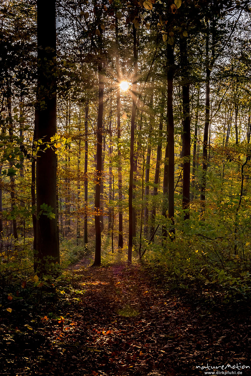 tief stehende Sonne scheint durch Herbstwald, Buchenwald mit ...