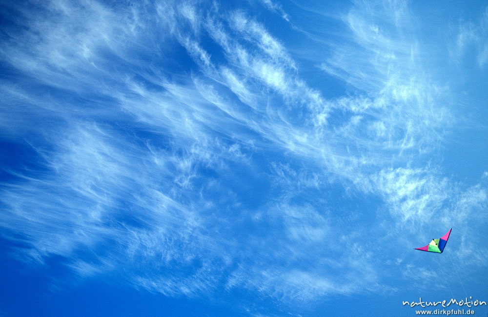 Lenkdrachen an blauem Himmel, Cirruswolken, Ragueness Plage, ...
