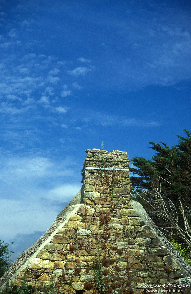Giebel mit Schornstein, Steinhaus vor blauem Himmel, Bretagn ...