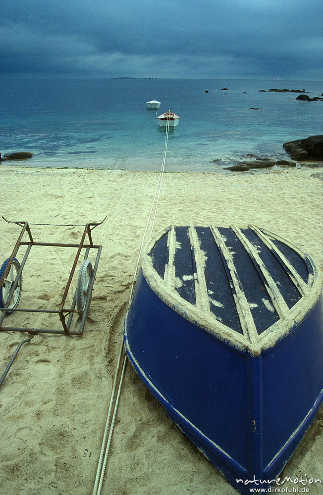 Ruderboot am Strand, dramatischer Himmel, Bretagne, Frankrei ...