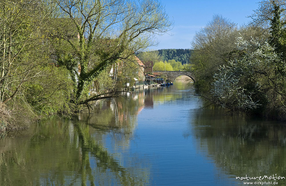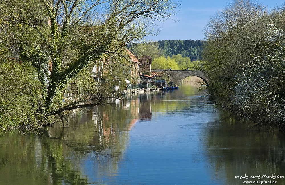 Flusslauf mit überhängenden Bäumen, steinerner Brücke un ...