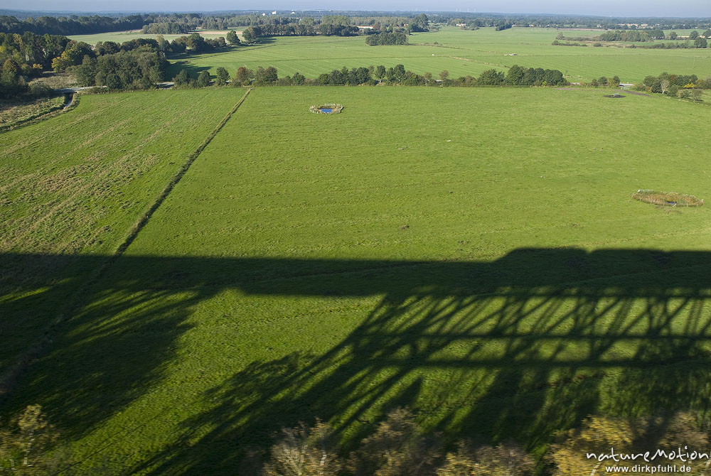 Zug fährt über Eisenbahnbrücke, Schattenwurf auf grüner ...