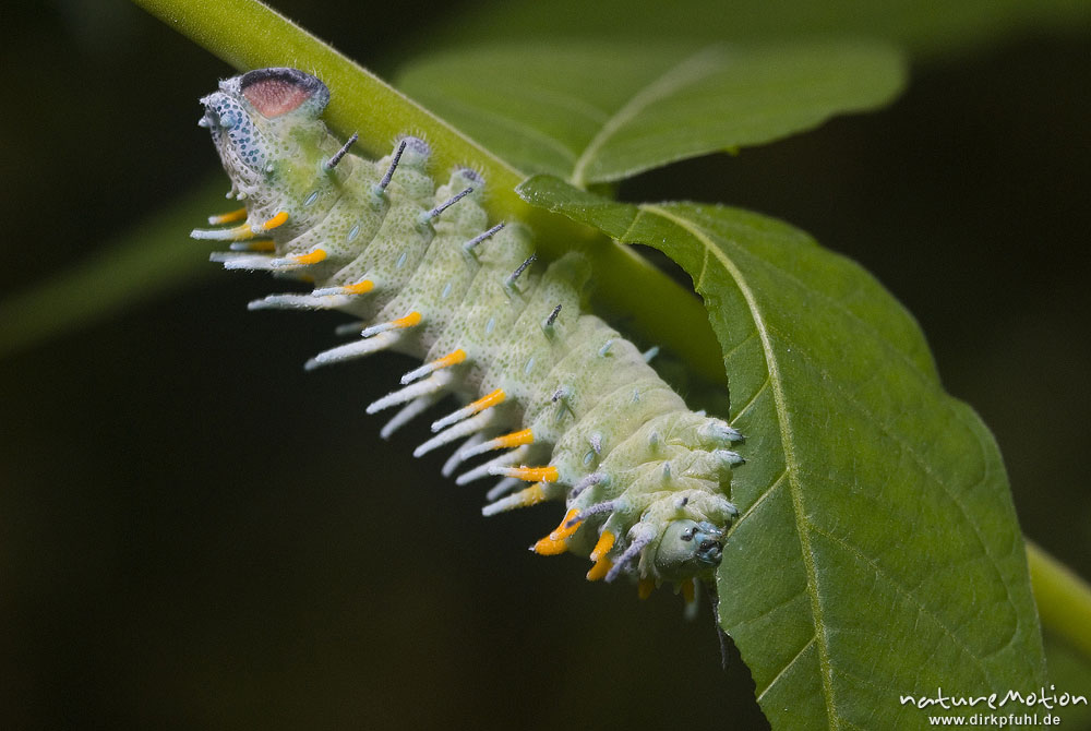 Nagelfleck, Aglia tau, Saturniidae, Kopf, Raupe an Zweig, GÃ ...