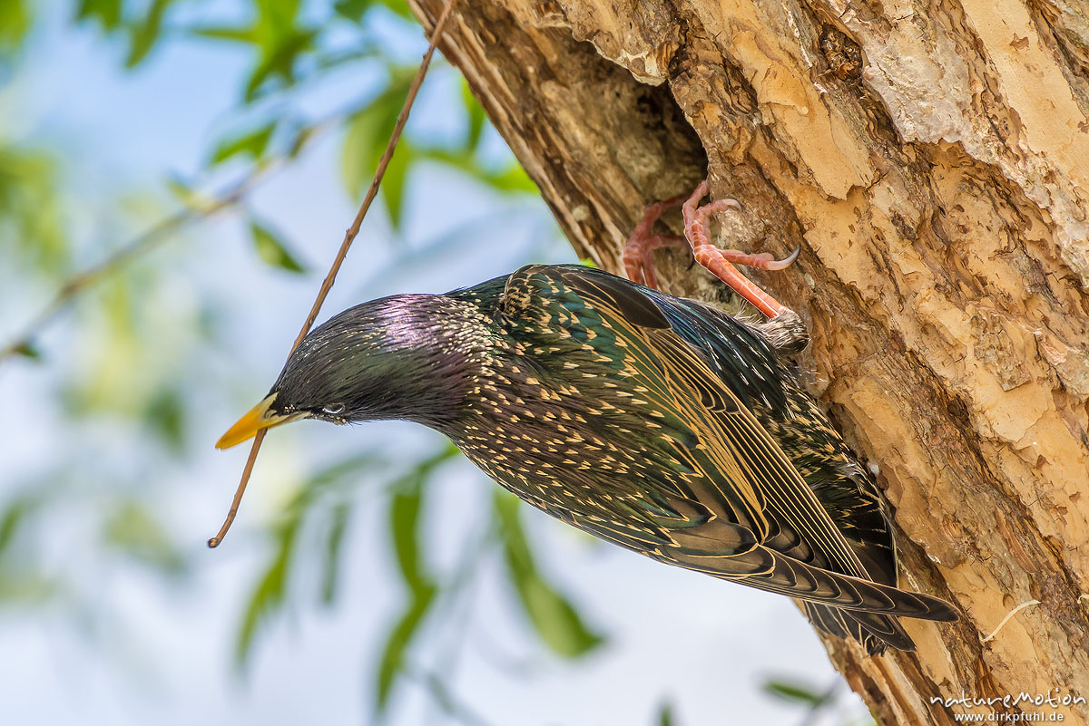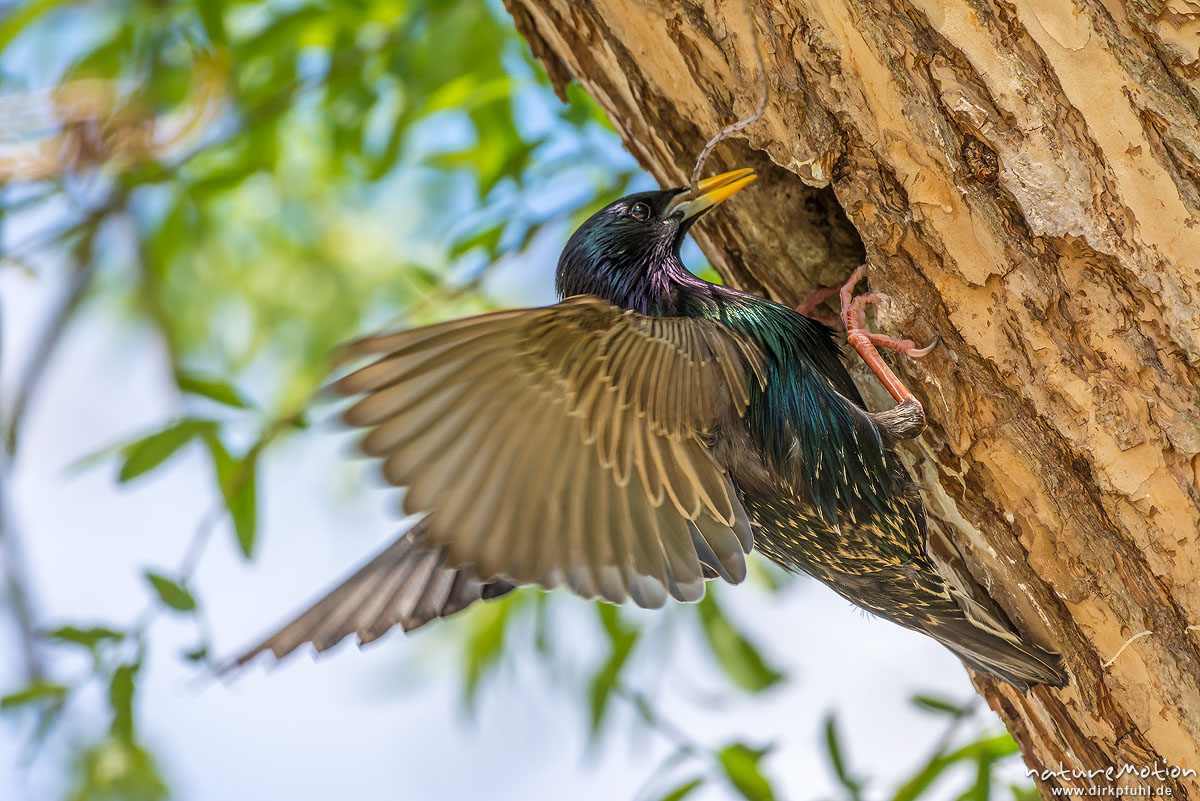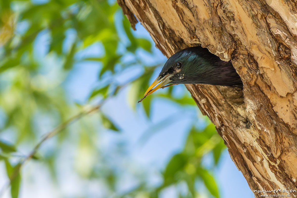 Star, Sturnus vulgaris, Sturnidae, Alttier an Nisthöhle, ve ...