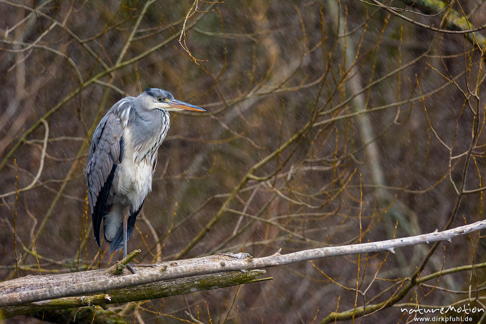 Graureiher, Ardea cinerea, Ardeidae, sitz im Geäast des Nis ...