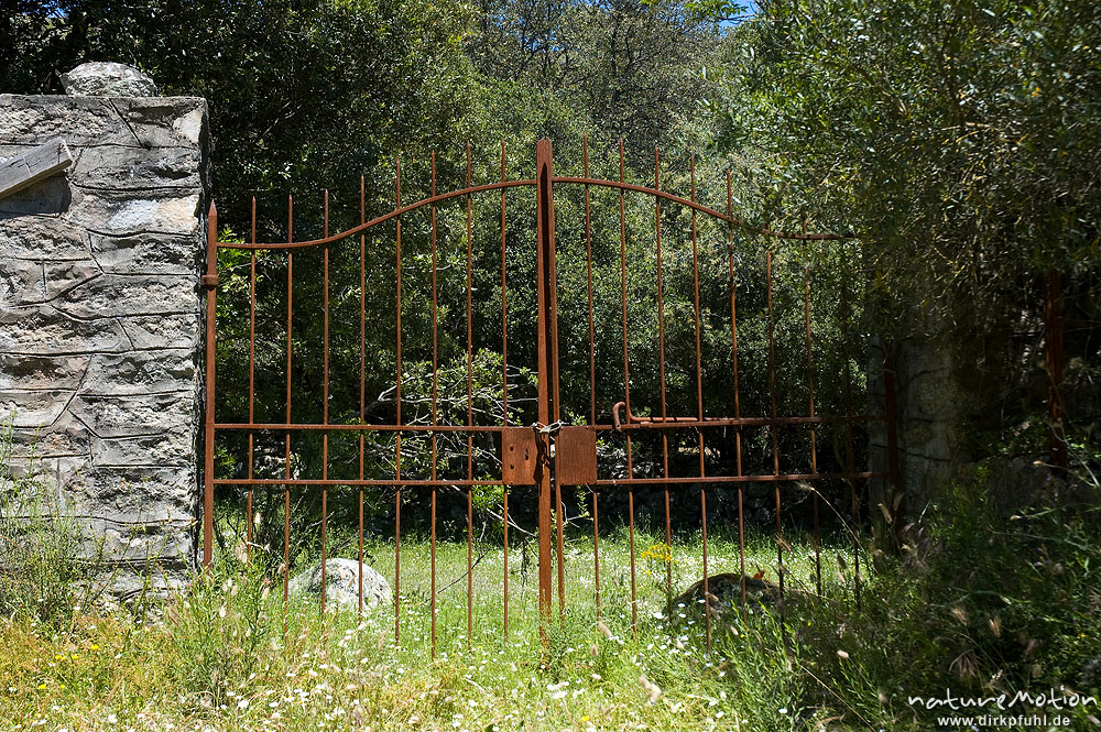 Kette mit Vorhängeschloss, schmiedeeisernes Tor, Restonica- ...