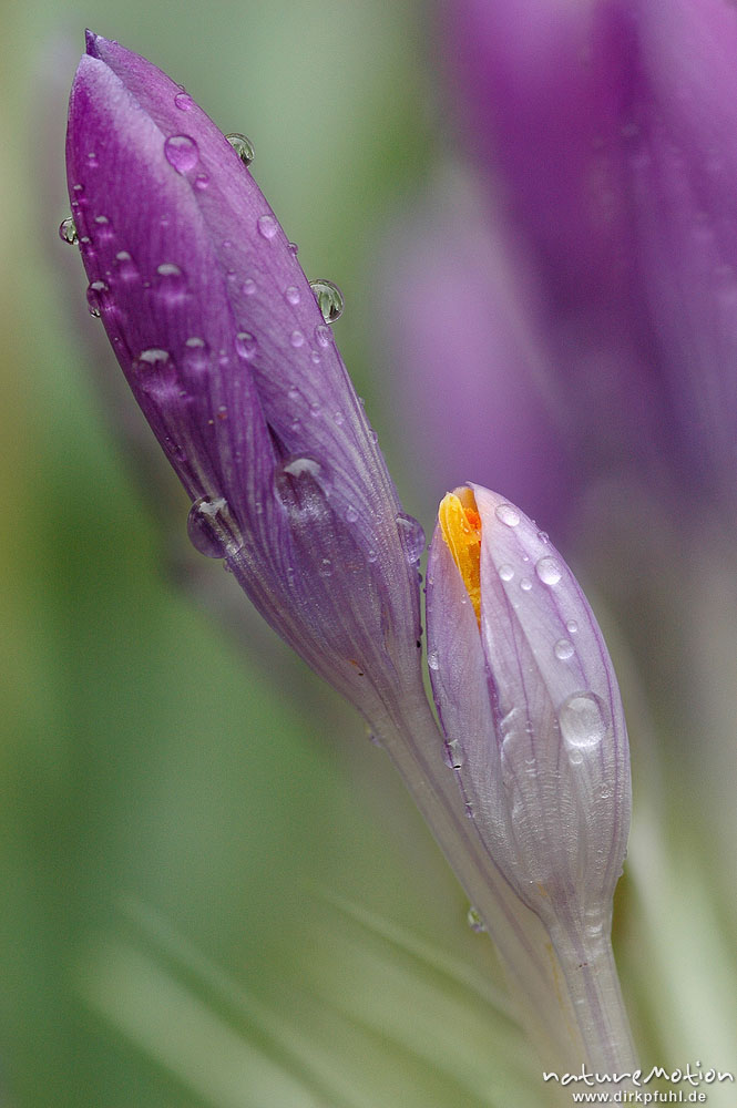 Krokus, Crocus sp., geschlossene Blüten mit Regentropfen, G ...