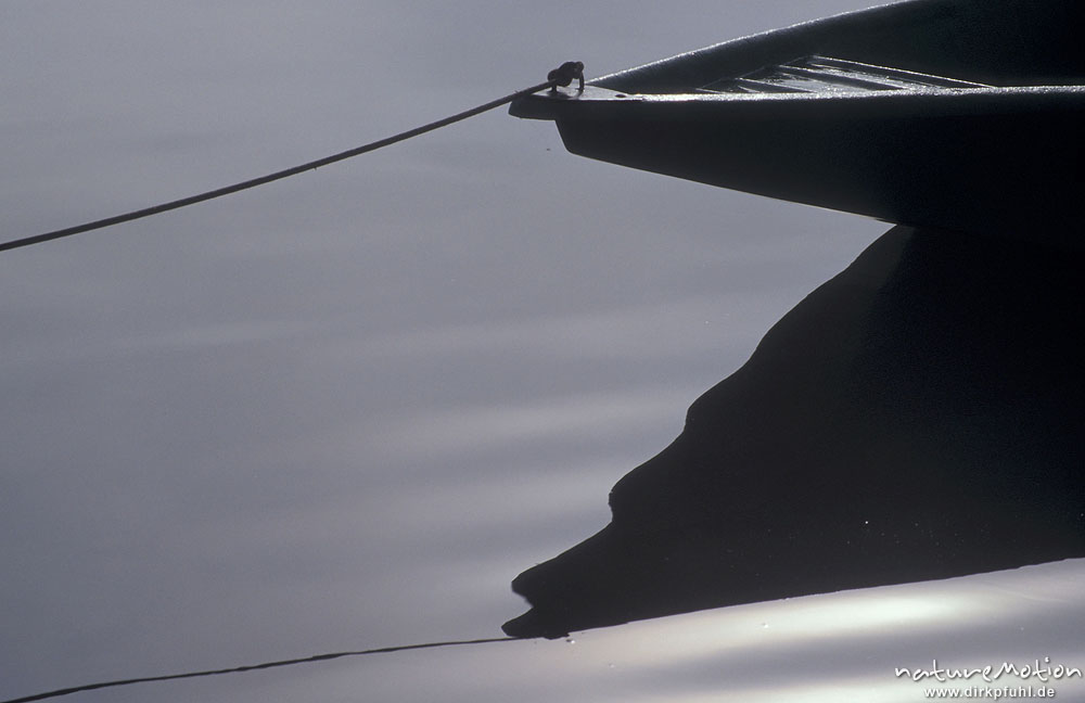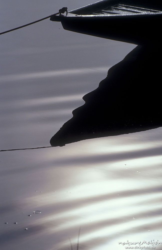 Bootsspitze spiegelt sich im Wasser, sanfte Wellen, Gegenlic ...