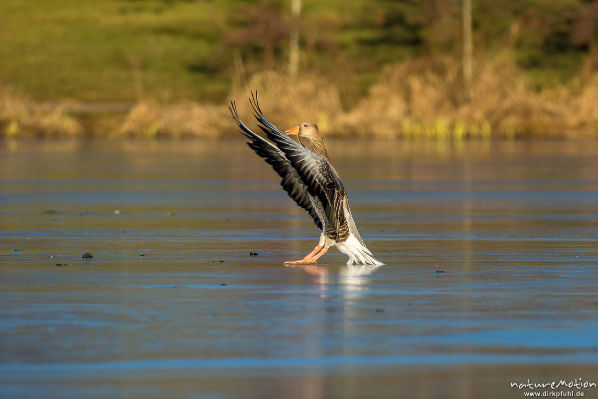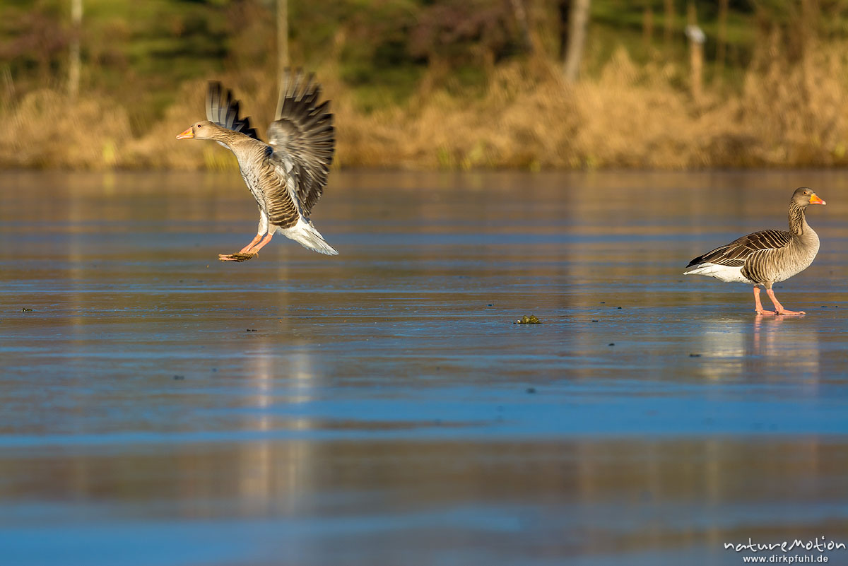 Graugans, Anser anser, Anatidae, Landung auf dem Eis eines f ...