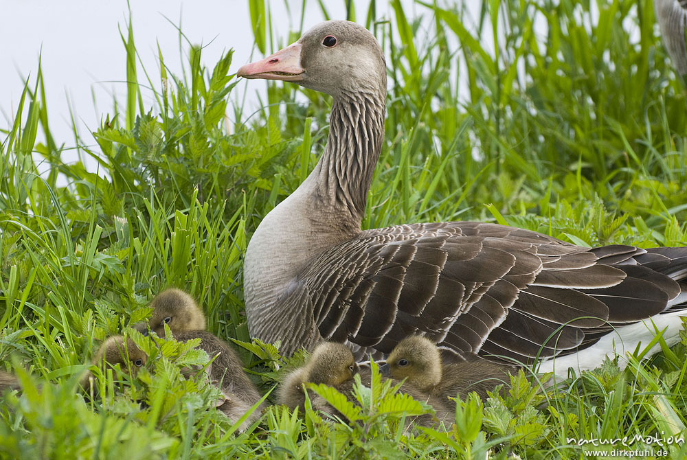 Graugans, Anser anser, Anatidae, 4 Küken liegen eng beieina ...