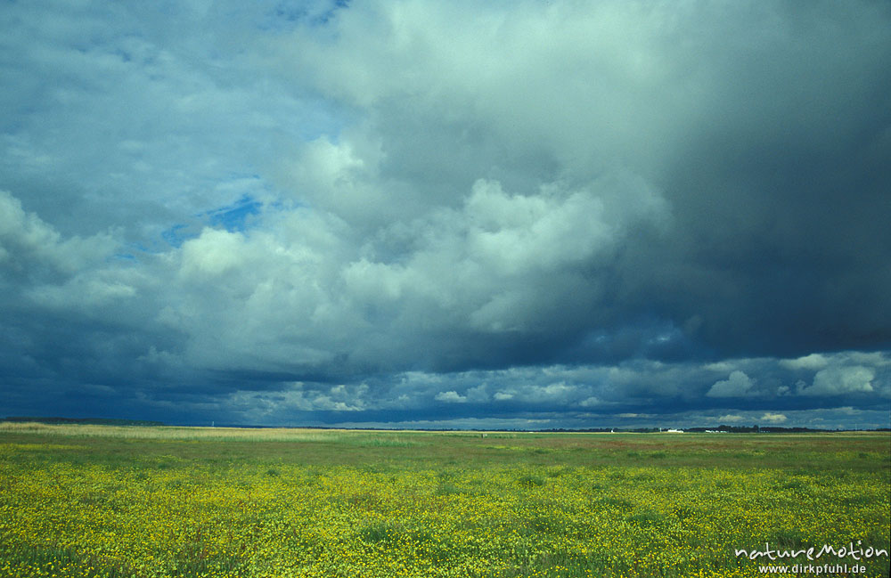 Regenwolken über gelb blühender Wiese, Hiddensee, Hiddense ...