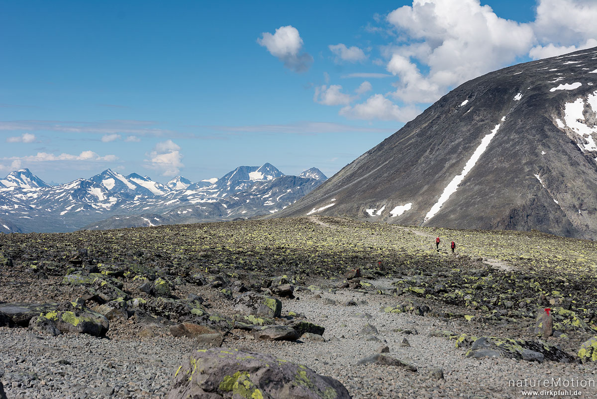 Geröllfeld, Höhenzüge mit Schneefledern, Wanderweg vom Ve ...