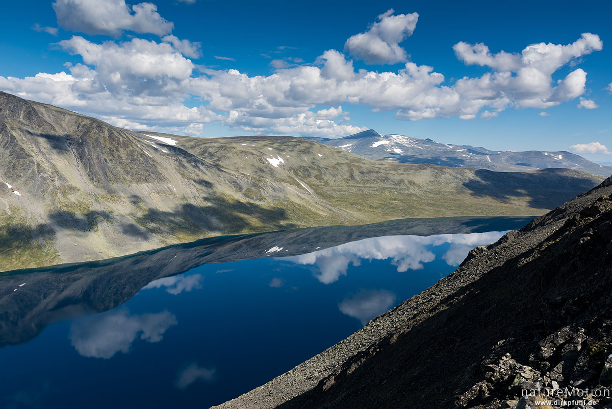 Bessvatnet, Wolken spiegeln sich in der Wasseroberfläche, A ...