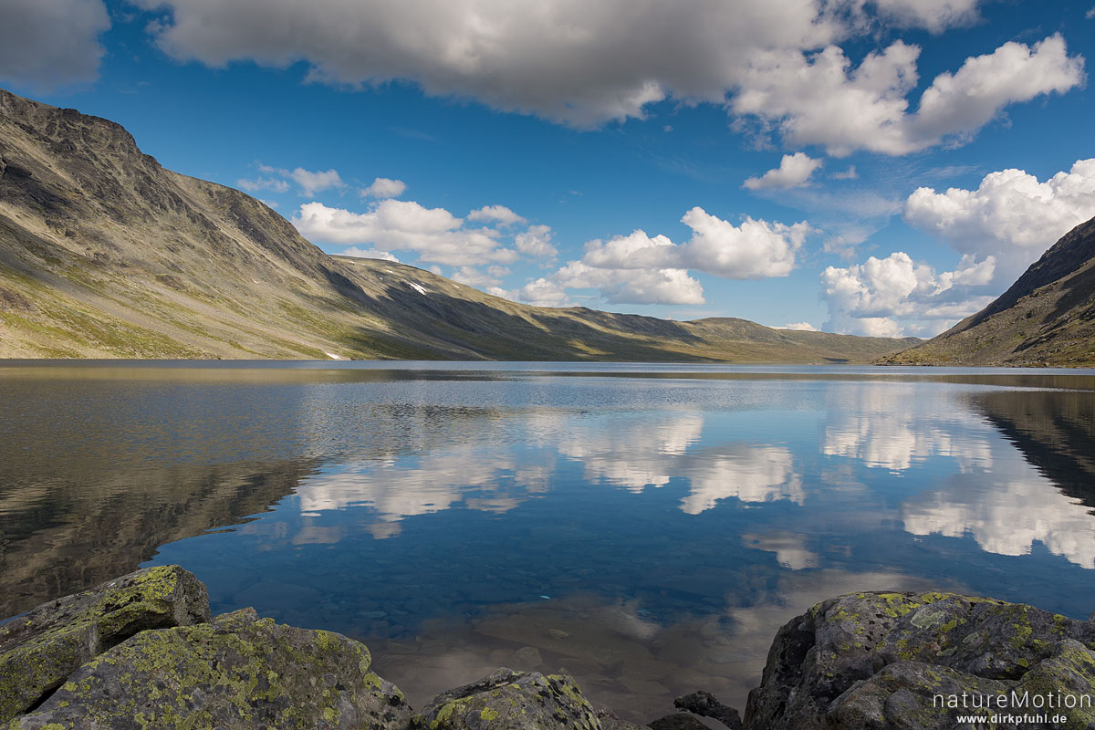 Bessvatnet, Wolken spiegeln sich in der Wasseroberfläche, B ...